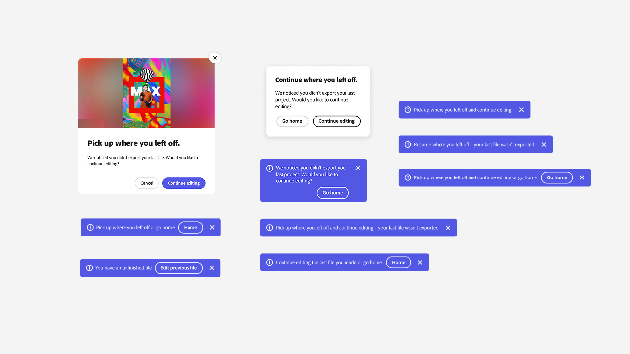 Taking users to their most recent file rather than the homepage as expected can risk frustrating the user, so the messaging and the form in which the message came across was important. We needed to explain why the user is taken somewhere else on the website or app, and offer users the ability to return to the intended experience.