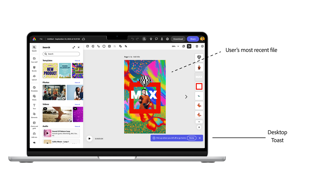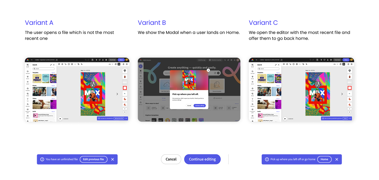 We proposed taking users back into the their last project on their return visit to Adobe Express.