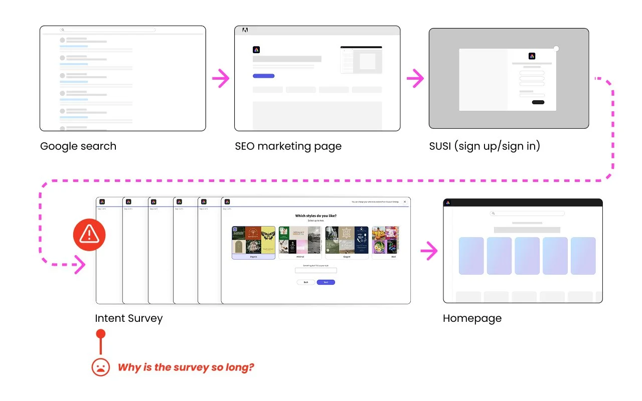 While the homepage experience is a primary pain point, a full homepage redesign was out-of-scope as parallel teams were already addressing its complexity. Consequently, we had to architect a high-impact solution that functions independently of the landing page, ensuring a seamless "resume" workflow regardless of existing homepage hurdles.
